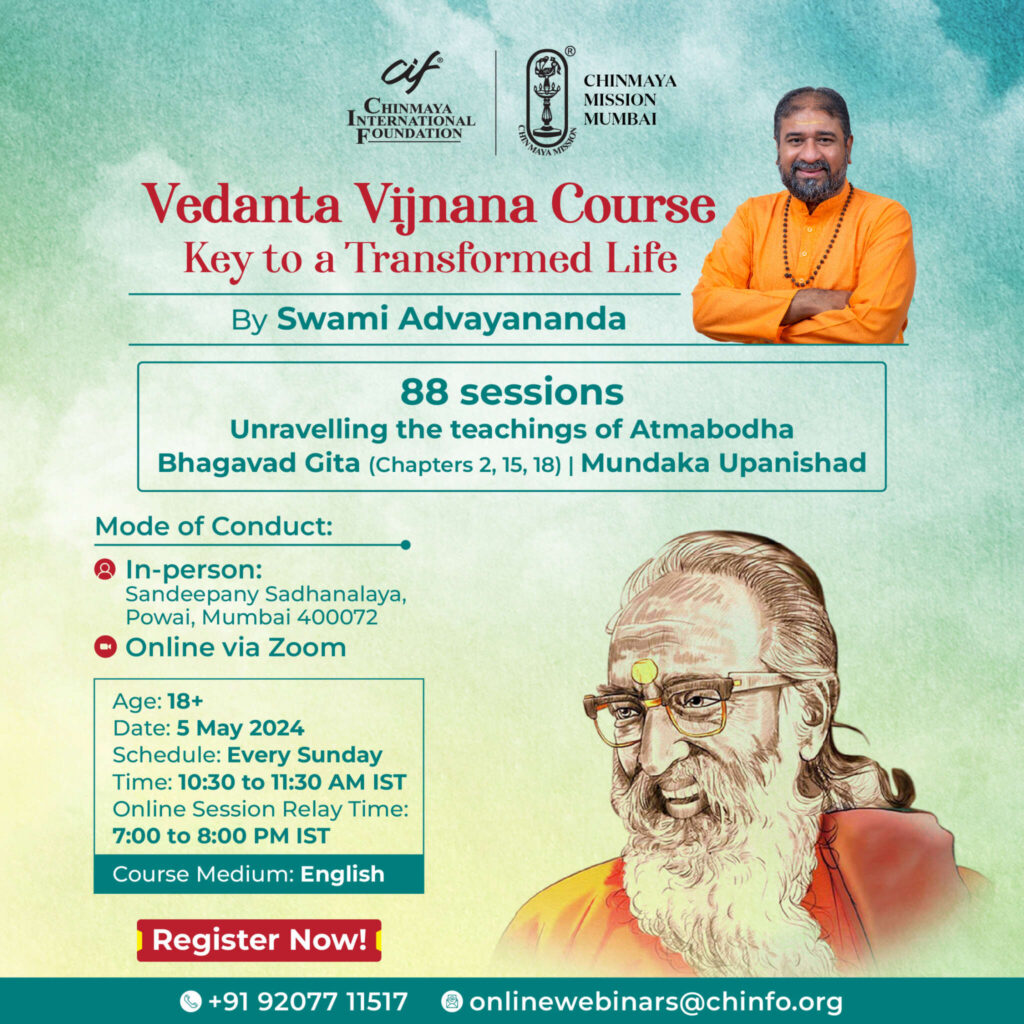 Vedanta Vijnana Course – Key to a Transformed Life is a Course designed by Swami Advayananda, the Resident Acharya of the Sandeepany Vedanta Course, to enable both a novice and a sincere seeker to study deeply the essentials of Vedanta to live a transformed and evolved life. The Course will span 88 Sundays with one-hour […]